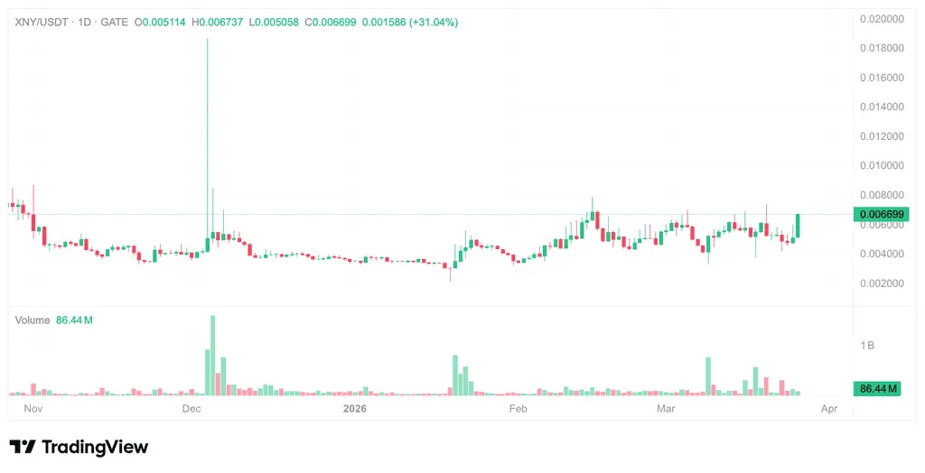 Станом на 26 березня 2026 року, згідно з даними Gate, ціна XNY становила 0,006034 долара США, за останні 24 години зміни склали +9,47%, обсяг торгів за цей період — 630 330 доларів. За останні 30 днів ціна XNY зросла на +16,66%, що свідчить про незалежну цінову тенденцію активу на тлі загальної волатильності ринку.