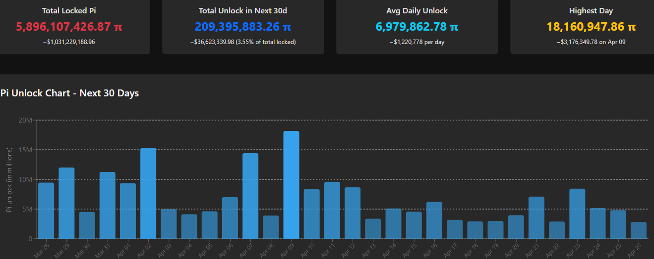 Дані PiScan показують, що середнє щоденне розблокування токенів PI протягом наступного місяця буде відносно високим — близько 7 мільйонів. Є кілька днів, коли буде вивільнено понад 10 мільйонів монет, що може посилити негайний тиск продажів і призвести до подальших падінь.