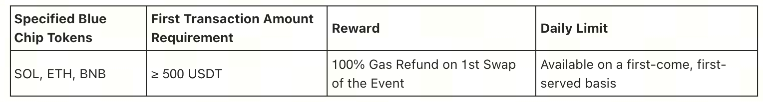 Trong thời gian diễn ra sự kiện, dù bạn là người dùng mới hay hiện tại, nếu giao dịch hoán đổi đầu tiên của bạn trong thời gian sự kiện với các "Token Blue Chip" chỉ định trên Gate Swap đáp ứng ngưỡng số lượng giao dịch, bạn sẽ nhận hoàn lại 100% phí Gas (tối đa 30 USDT). Tổng quỹ phần thưởng là 20.000 USDT, áp dụng theo thứ tự đăng ký trước.