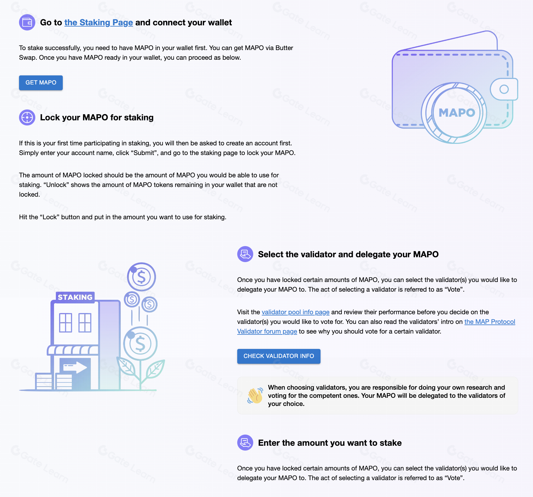 Staking là một phần cơ bản của MAP Protocol, đảm bảo an ninh mạng và sự tham gia của người dùng. Cách hoạt động của nó như sau: