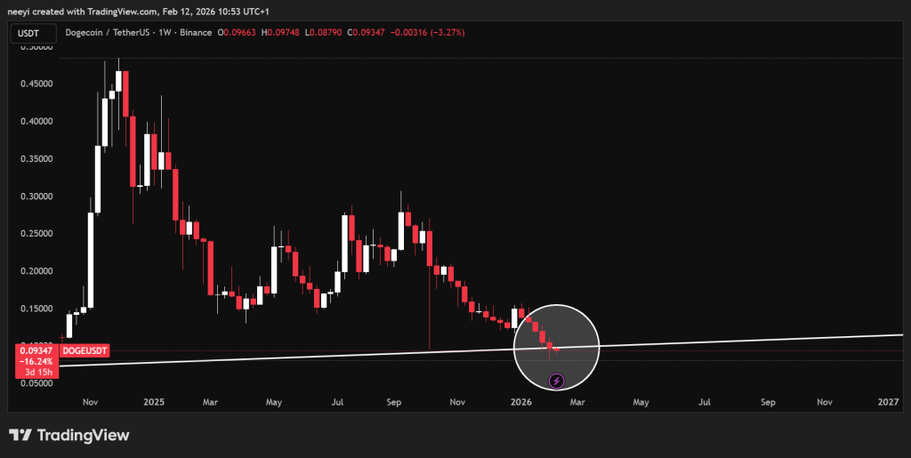 Giá sau đó tiếp tục giảm và hình thành mô hình các đỉnh thấp hơn và đáy thấp hơn trong các tháng tiếp theo. Tài sản này đã chạm vào vùng gần 0,1 đô la vào năm 2025 và còn trượt xa hơn nữa vào năm 2026 mà không có dấu hiệu rõ ràng của sự trở lại sức mạnh.
