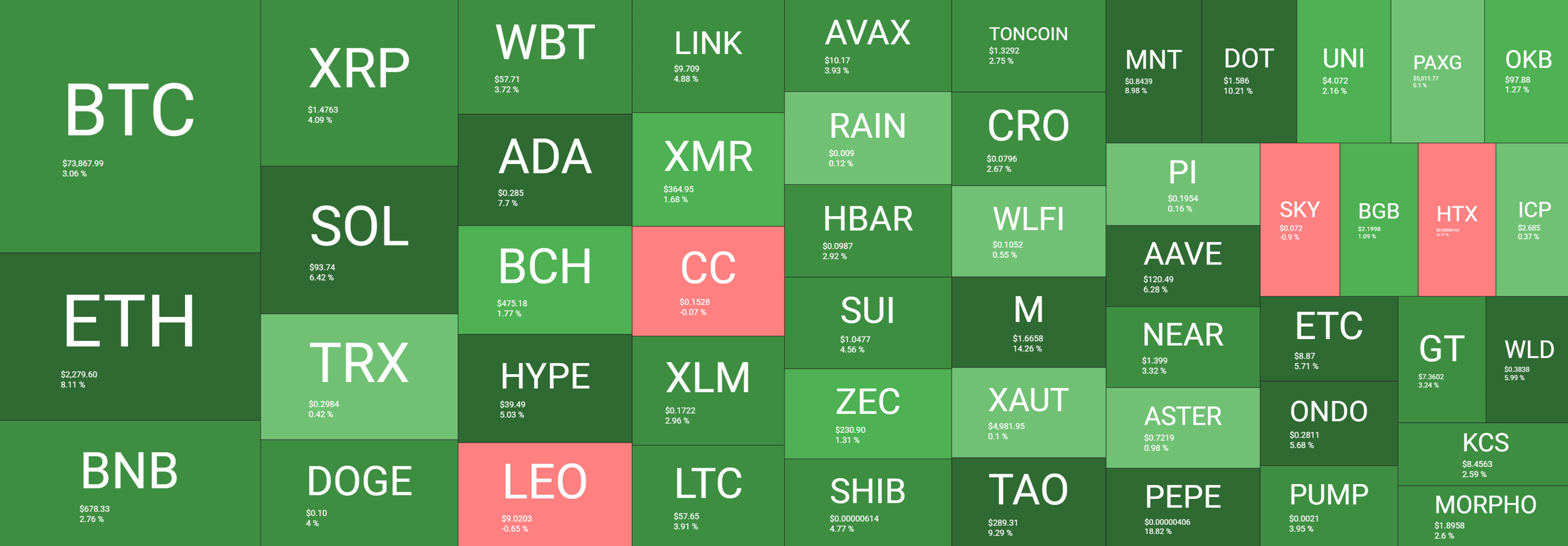 Giá Bitcoin hôm nay đã bứt phá lên trên $74,400, đánh dấu mức cao trong nhiều tuần và thổi bùng lại sự lạc quan trên toàn thị trường tiền mã hóa nói chung, điều này được thể hiện qua việc các altcoin tăng giá.