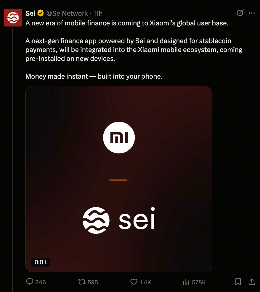 Sei Network 於 12 月 10 日正式宣布,將與全球第三大智慧型手機製造商小米展開深度合作。未來針對全球多數市場推出的新款小米手機,將預載一款由 Sei 技術驅動的次世代加密應用程式。本次合作不涵蓋中國大陸及美國,但涵蓋小米大部分海外銷售區域。