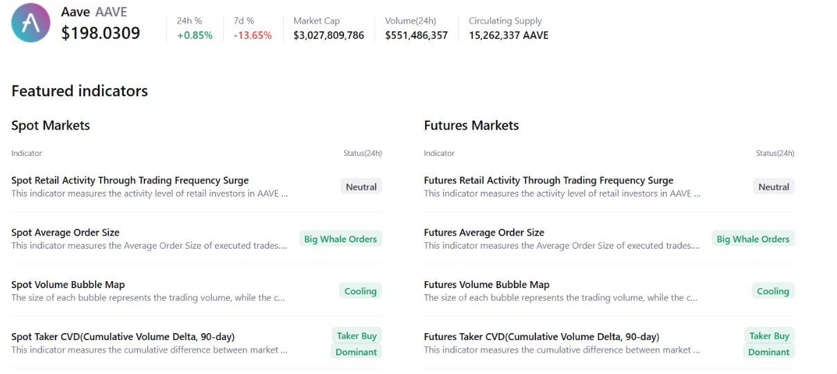 來自CryptoQuant的綜合數據顯示,AAVE的積極前景繼續得到鞏固。現貨市場和衍生品市場均記錄到來自鯨魚的大額買單,市場條件降溫,需求佔主導地位,表明收復失地的趨勢正在逐漸形成。