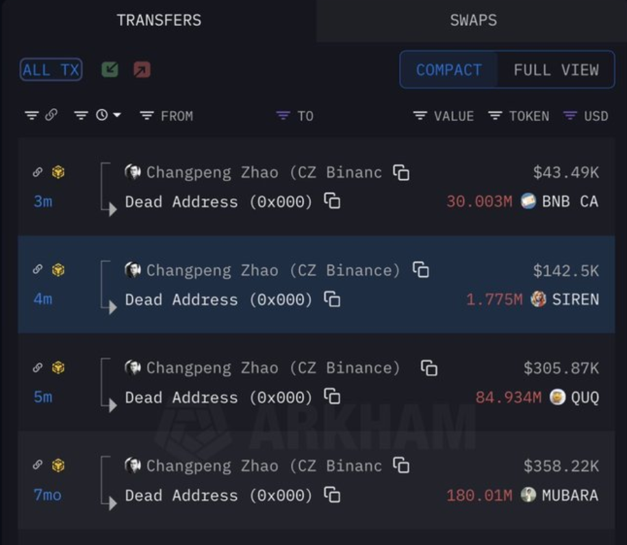 CZ繼續引起關注,公開捐贈錢包中燃燒了超過490,000 USD的Meme代幣