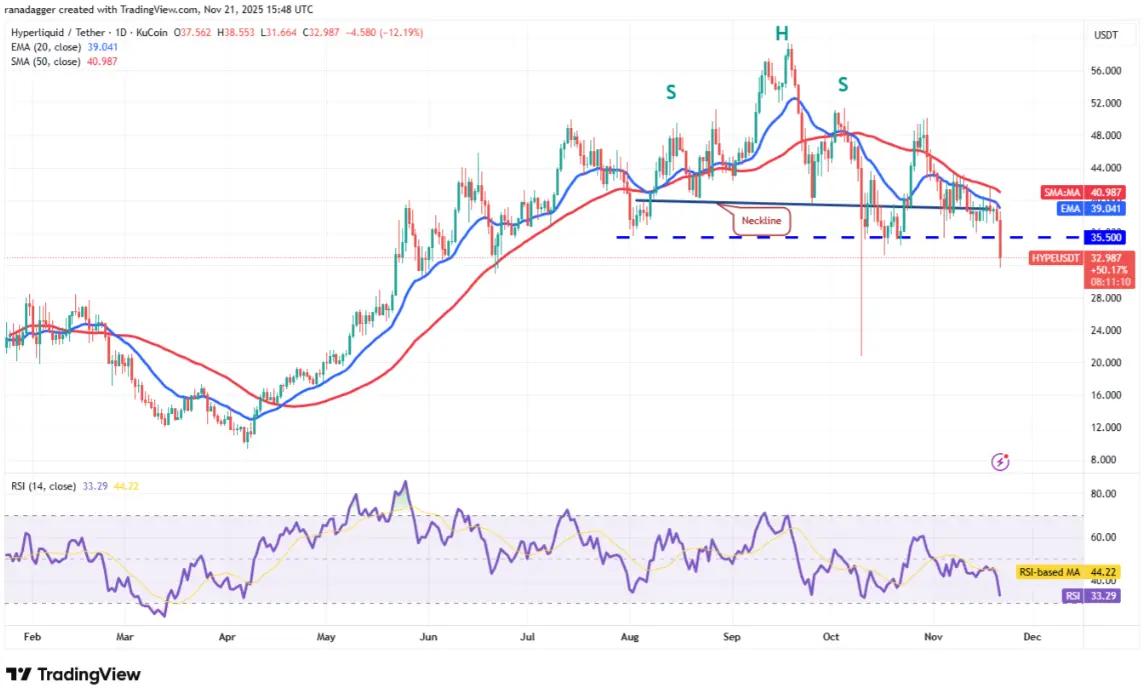 Hyperliquid (HYPE)週四嘗試突破20日EMA (39.04美元),但空頭守勢未減。
