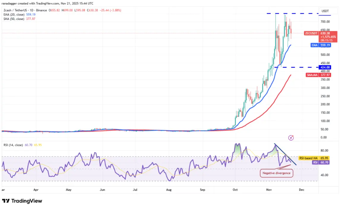 Zcash (ZEC)週二自20日EMA (559美元)反彈,但漲勢於750美元遇到強大賣壓。