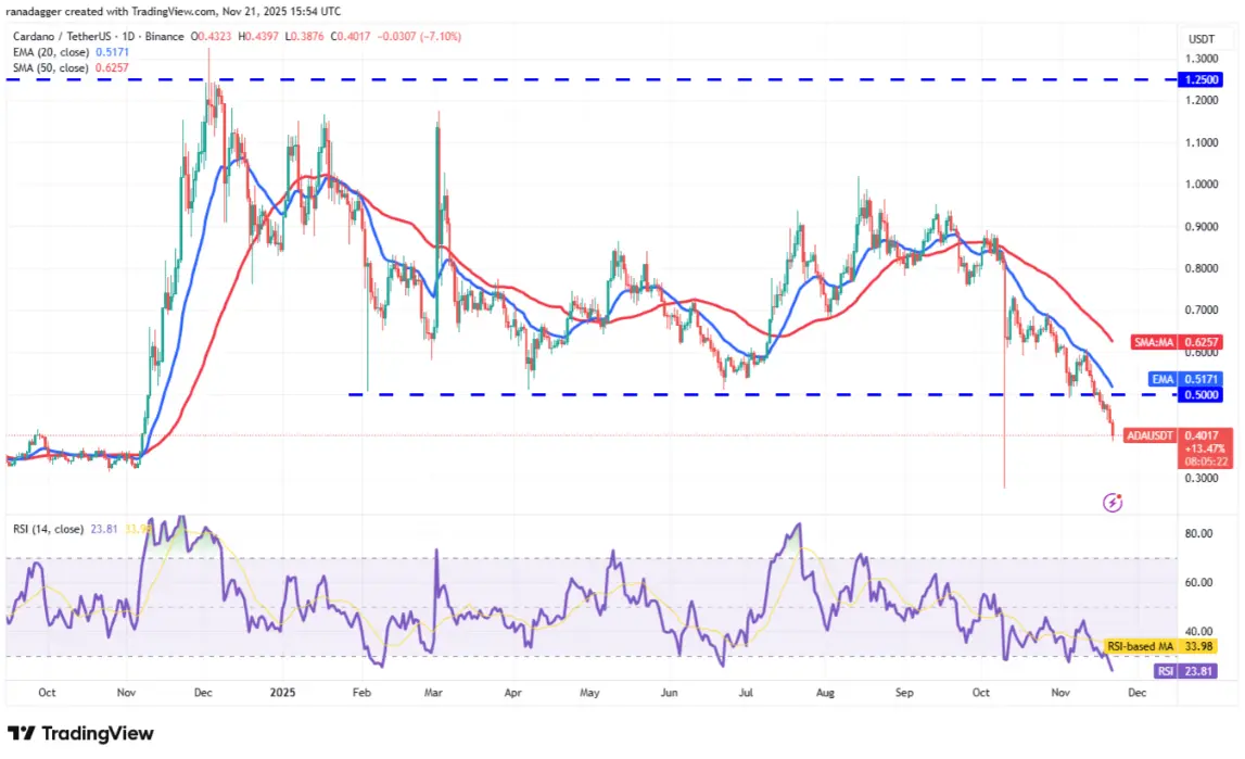 Cardano (ADA)持續下挫,已觸及首個支撐0.40美元,顯示空頭掌控市場。