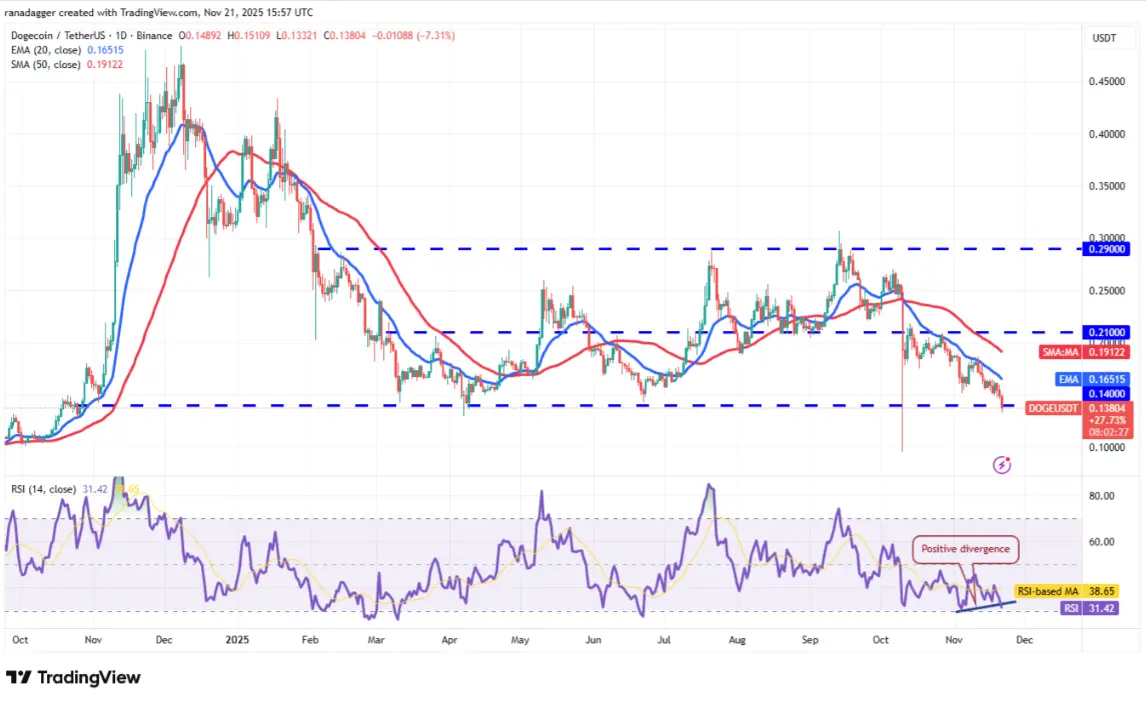 Dogecoin (DOGE)價格已觸及0.14–0.29美元區間底部,預期將有買盤介入。