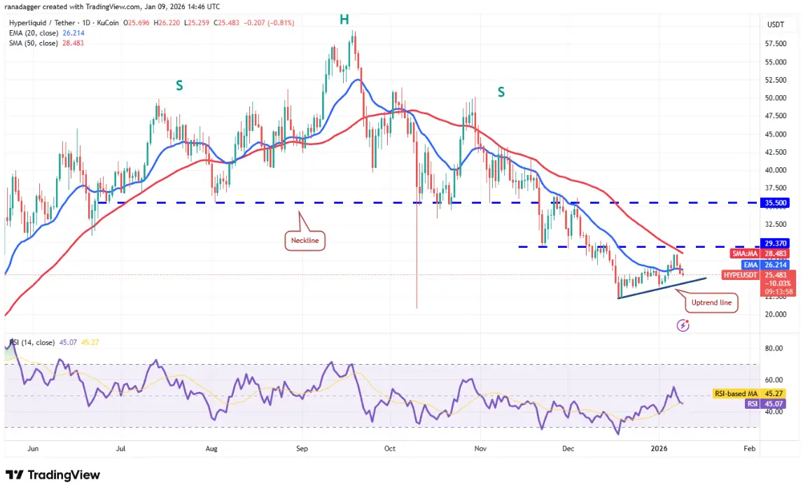 Hyperliquid(HYPE)目前在25.05美元附近交易,周三從50日SMA(28.48美元)回落,並在周四跌破20日EMA(26.21美元)。