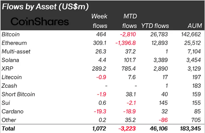 XRP錄得歷史最高周流入,總計2.89億美元,過去六周的流入佔管理資產( AuM)的29%,這可能與美國最近的ETF發布有關。另一方面,Cardano錄得流出1930萬美元,相當於其AuM的23%。