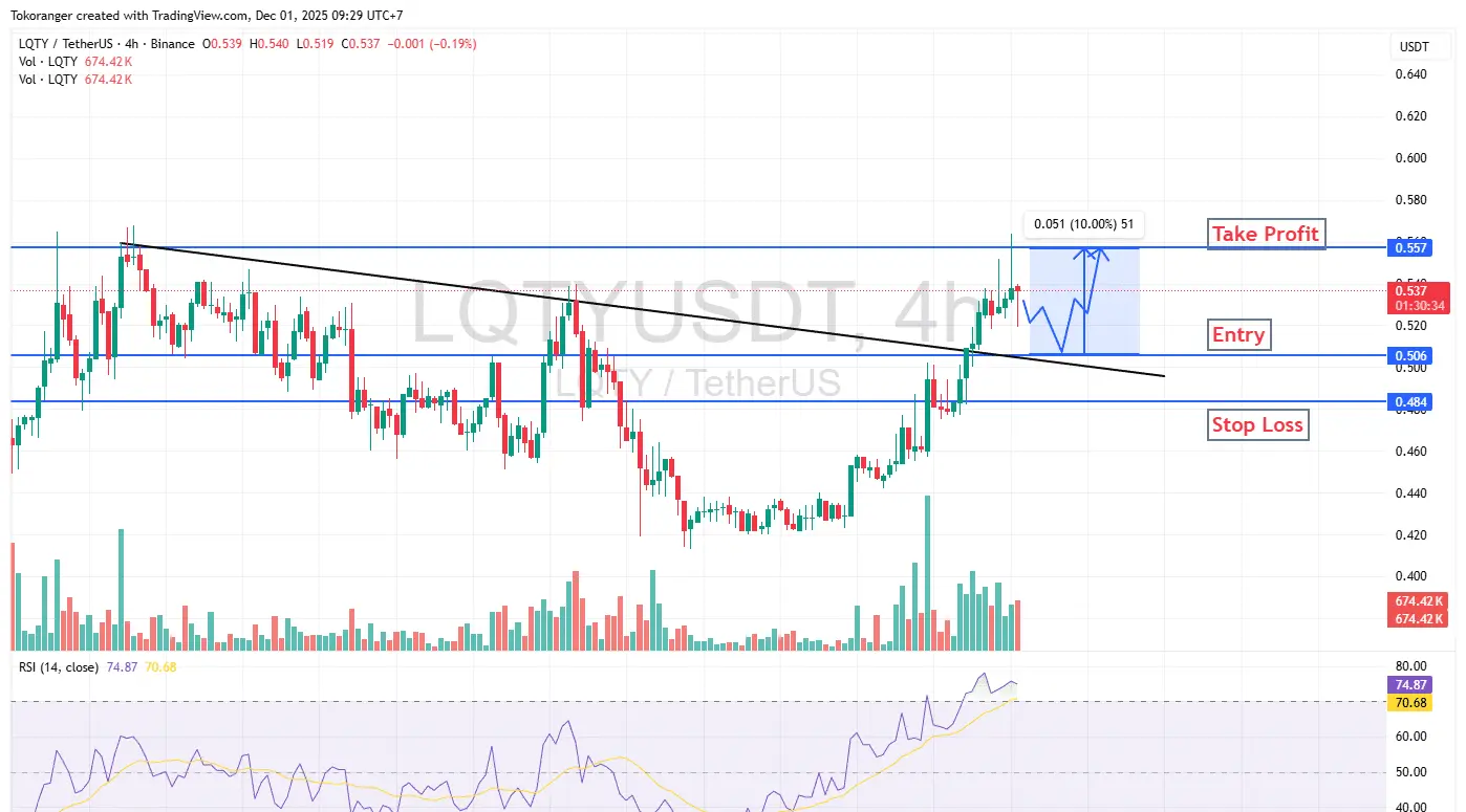 LQTY當前走勢展現多頭能量逐漸完善,價格突破下降趨勢線並穩居$0.506支撐區。RSI處於強勢(70+)區,顯示買盤動能雖強但短線有小幅回調風險。只要價格能穩定於$0.520進場區上方,上攻$0.557壓力目標仍有極大空間,因為K線結構正健康地形成higher low上升格局。