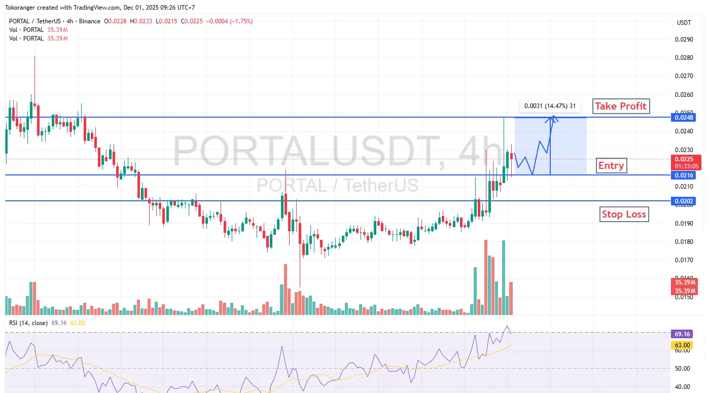 PORTAL/USDT展現“逐步上行”,價格自$0.0216支撐反彈後緩步走高。成交量同步放大,RSI轉向多頭區,顯示買盤壓力開始主導。只要價格穩站在$0.0216進場區,挑戰$0.0248壓力(止盈)機會增大,特別是前高swing-high尚未被觸及。