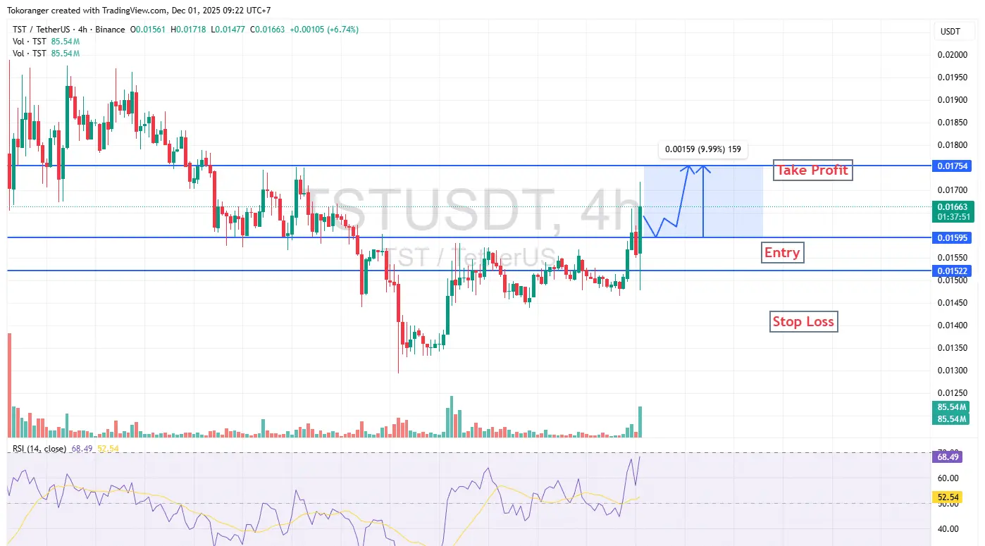 TST目前展現自$0.01522 – $0.01595需求區反彈的動能,且近期成交量的上升顯示買方開始主導。價格結構仍在“緩步攀升通道”中,目標直指$0.01754強壓區,該區同時也是理想止盈區,歷史上經常出現回落。