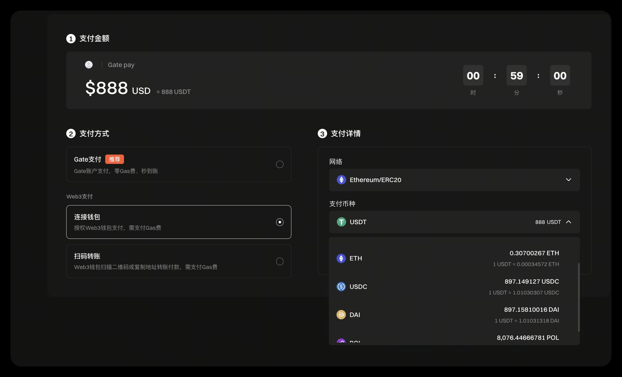 用户在结算时可自由选择支付币种,系统会基于实时汇率自动展示应付金额;支付完成后,Gate Pay 会自动将收款金额兑换为订单指定的结算币种并入账。商户无需自行计算汇率,也无需处理跨币种对账,大幅减少运营复杂度。
