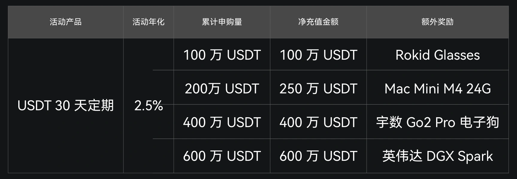 余币宝限时推出 VIP 专享理财,年化收益达 2.5%。用户完成报名后,将根据其活动期间的净充值与累计申购量逐级解锁额外奖励,最高可赢英伟达 DGX Spark(按达到的最高档位发放,不向下累加)。 点此申购