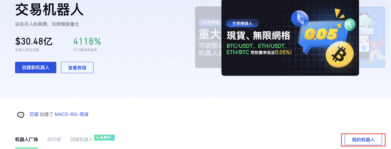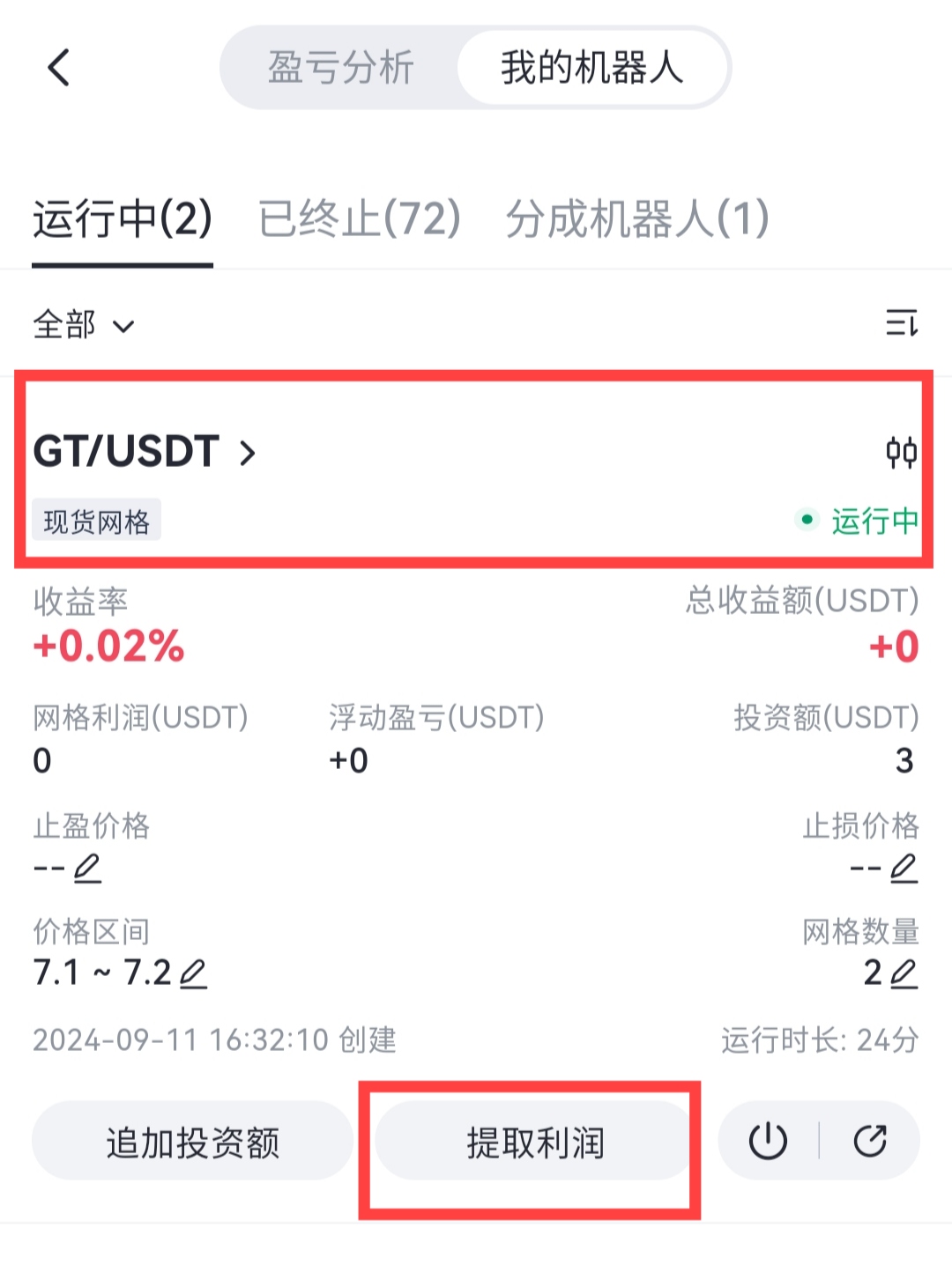 交易 - 交易机器人 - 我的机器人 - 运行中- 点击网格下方“提取利润”即可