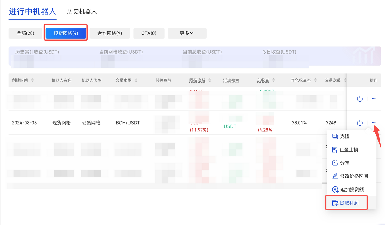 进入机器人主页 - 点击我的机器人 - 查看进行中机器人 - 选择现货网格 - 点击最右侧省略号图标 - 选择“提取利润”即可提取网格收益