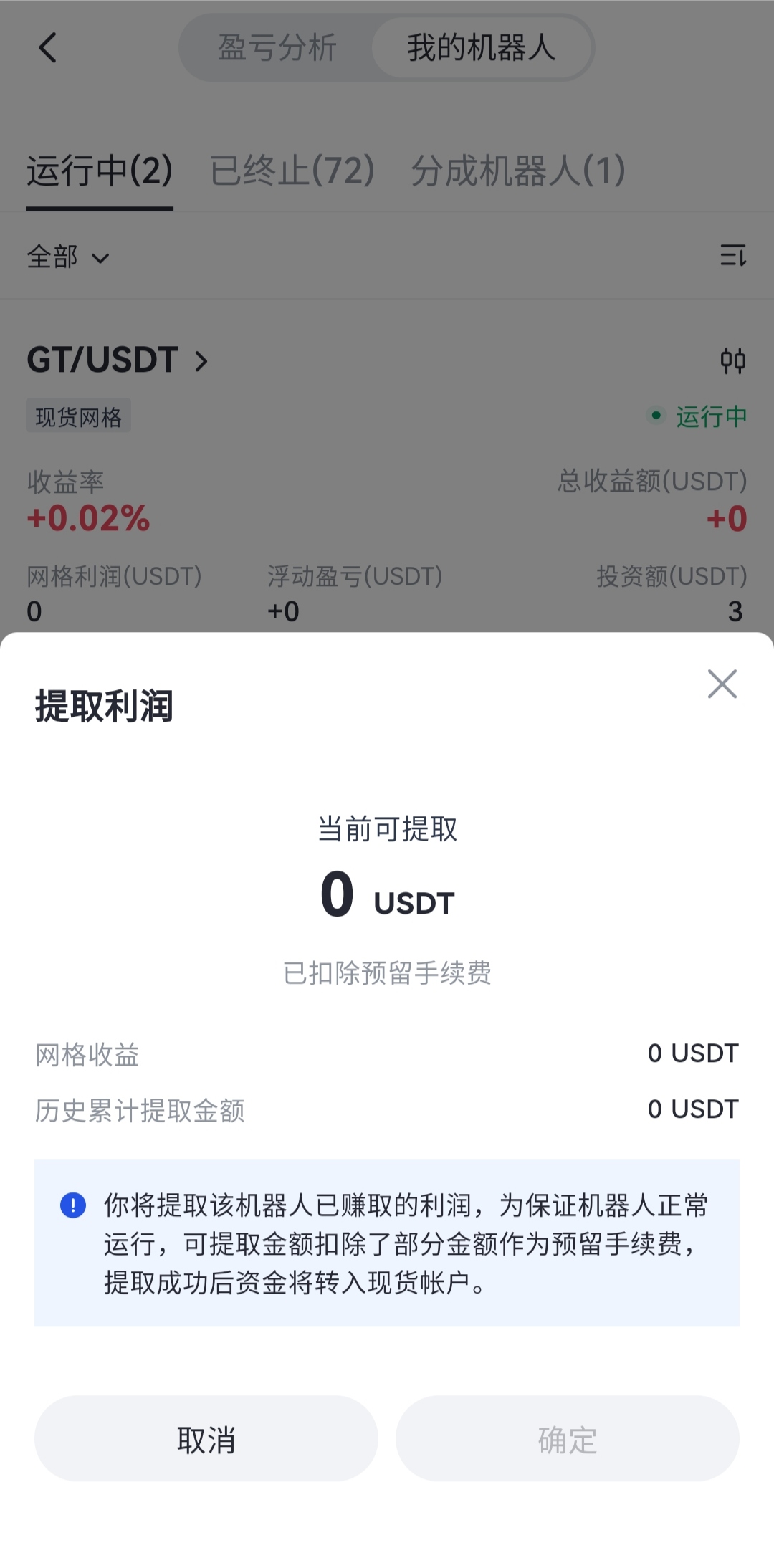 为保障用户权益,提升用户体验感,Gate 交易机器人现支持运行中现货网格收益提取。用户可随时提取已有现货网格收益,用户如认为未来交易风险过高,想要锁住利润,该功能支持机器人用户在实现盈利后可随时转出,最大程度保障自身利益,降低亏损。