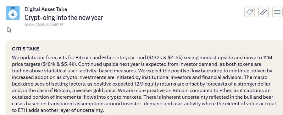 花旗银行预测比特币将在数月内达到231,000美元,以太坊将在数月内达到7,500美元
