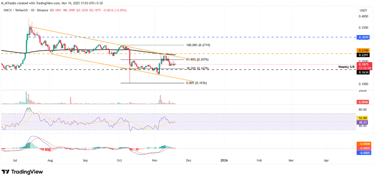 1INCH保持在接近0.18 USD的稳定,链上和衍生品数据暗示收复失地