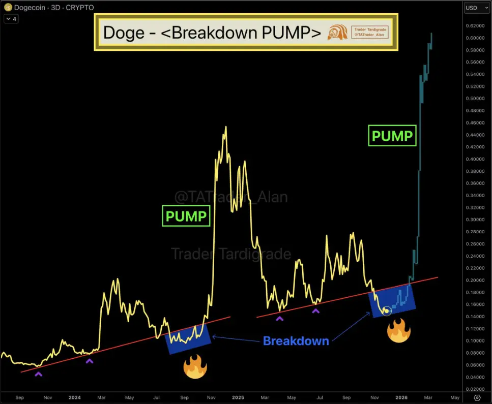 交易员 Tardigrade,一位在 X 上颇有声望的分析师,认为狗狗币有可能突破,甚至超过 0.60 USD 的关口。这个现象让人想起之前的下跌,当时狗狗币跌破了第二个支撑位,如图表所示。