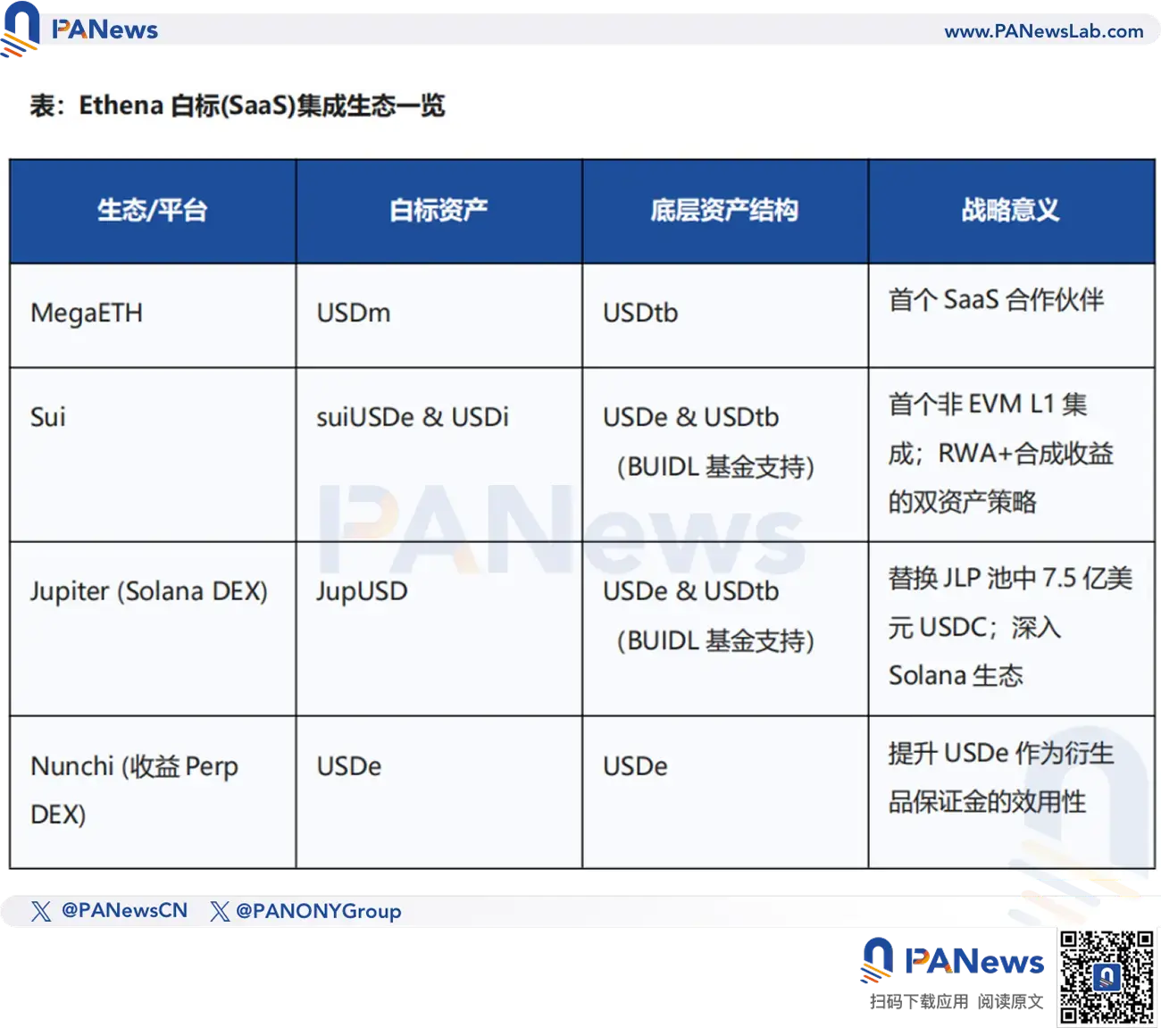 **目前,白标(WhiteLabel)平台是Ethena最重要的第二增长点。**这是一个SaaS(Stablecoin as a Service,稳定币即服务)产品,能够将协议的角色从资产发行方推向了基础设施提供商。白标平台允许高性能公链、消费者应用与钱包等市场参与方利用Ethena的底层基础设施,高效发行自己的定制化美元资产,目前已与DeFi、交易所和公链等达成了合作