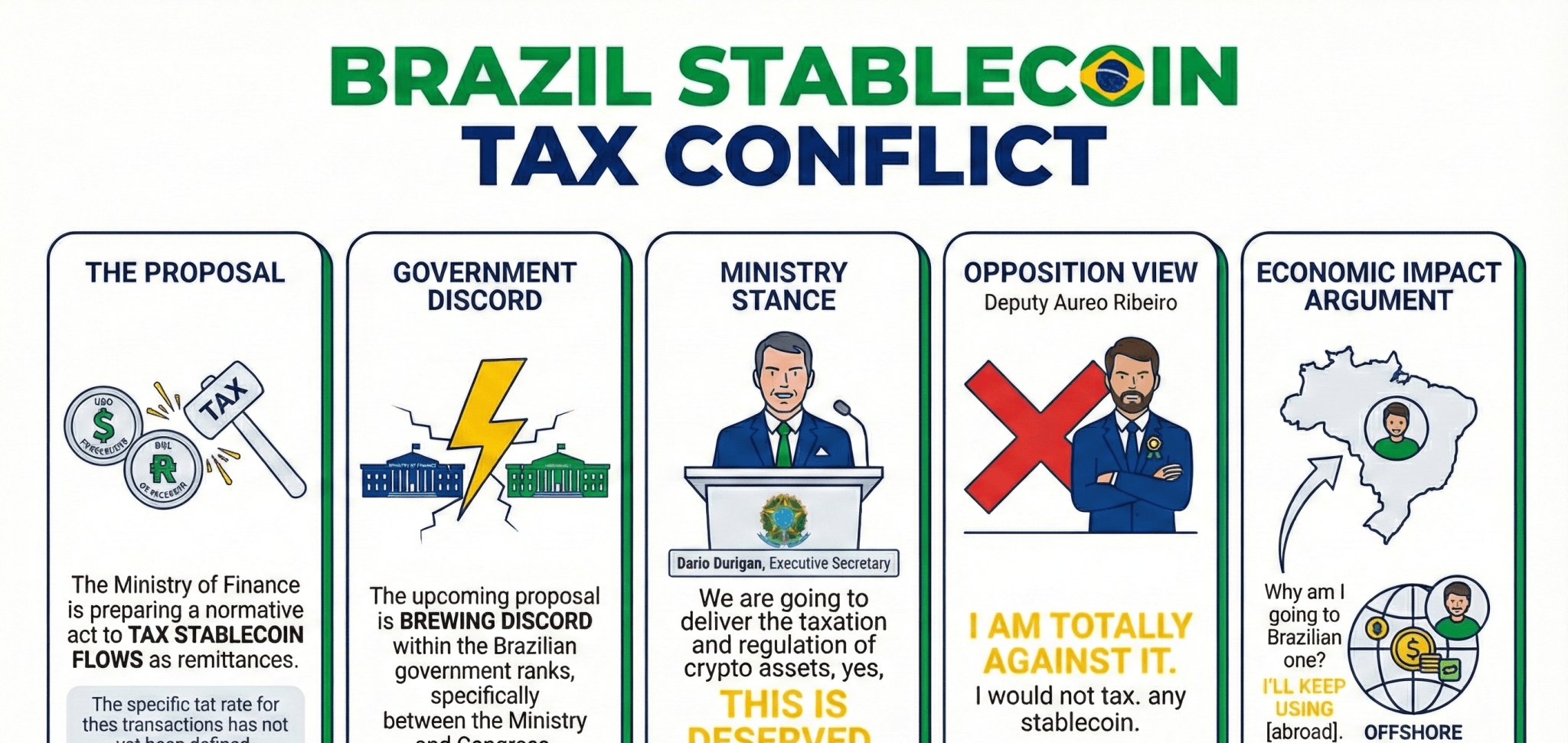 一项即将提出的提案,旨在将稳定币流动视为汇款征税,这在巴西政府内部引发了分歧,因为财政部准备采取行动。