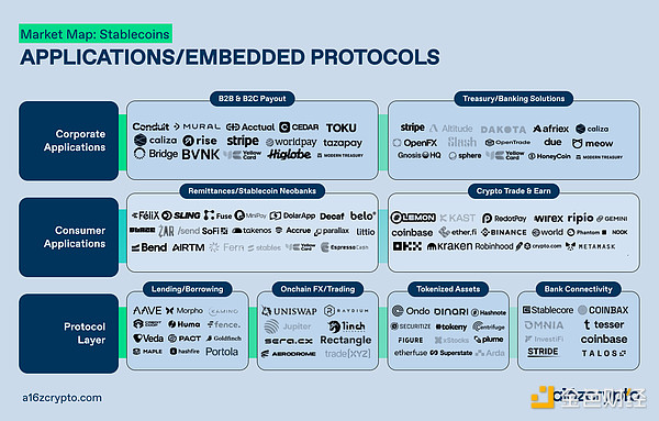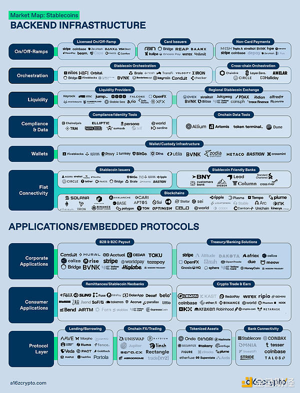 **稳定币是这场变革的催化剂。它早已从小众交易工具,演变为金融底层基建,正成为新一代全球金融产品的底层承载层。**本文附带的行业格局图谱,呈现了我们对这场正在发生的转型的研判。赛道内的具体企业或许会更迭,行业分类也将不断融合演变,但更核心的变革在于结构层面:全球金融全新技术栈如何逐步成型、哪些板块已走向成熟、以及目前仍存在哪些短板空白。